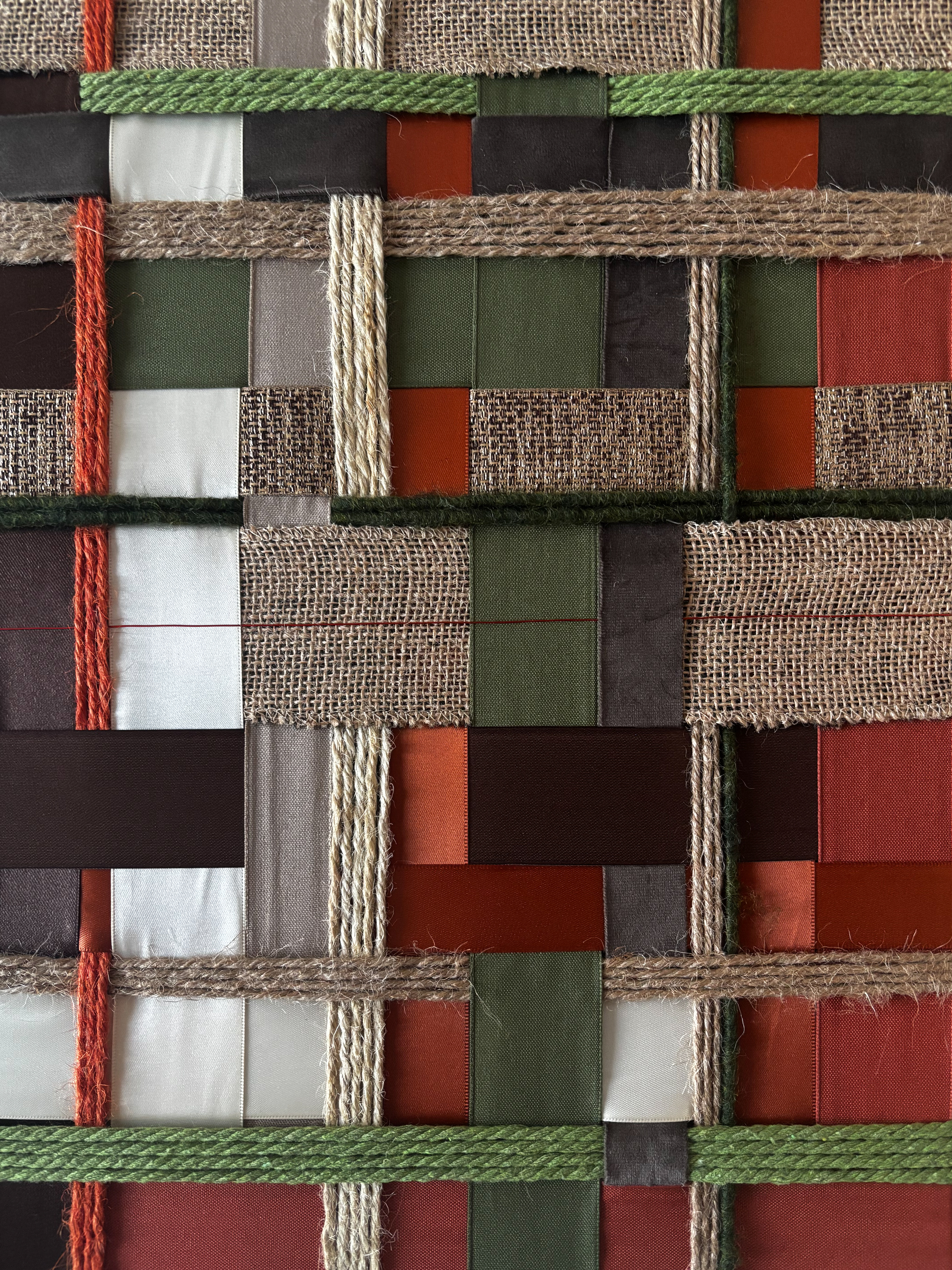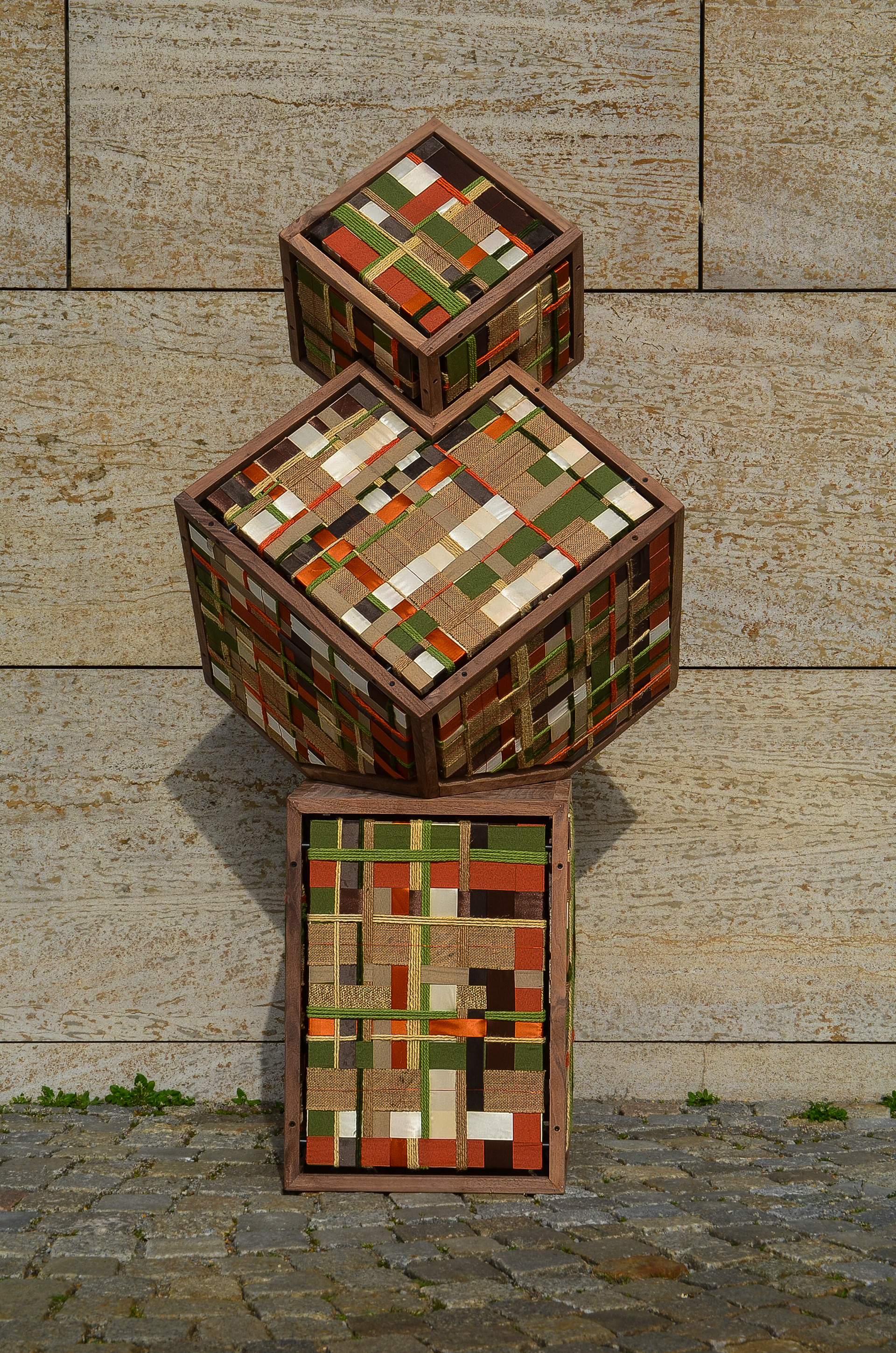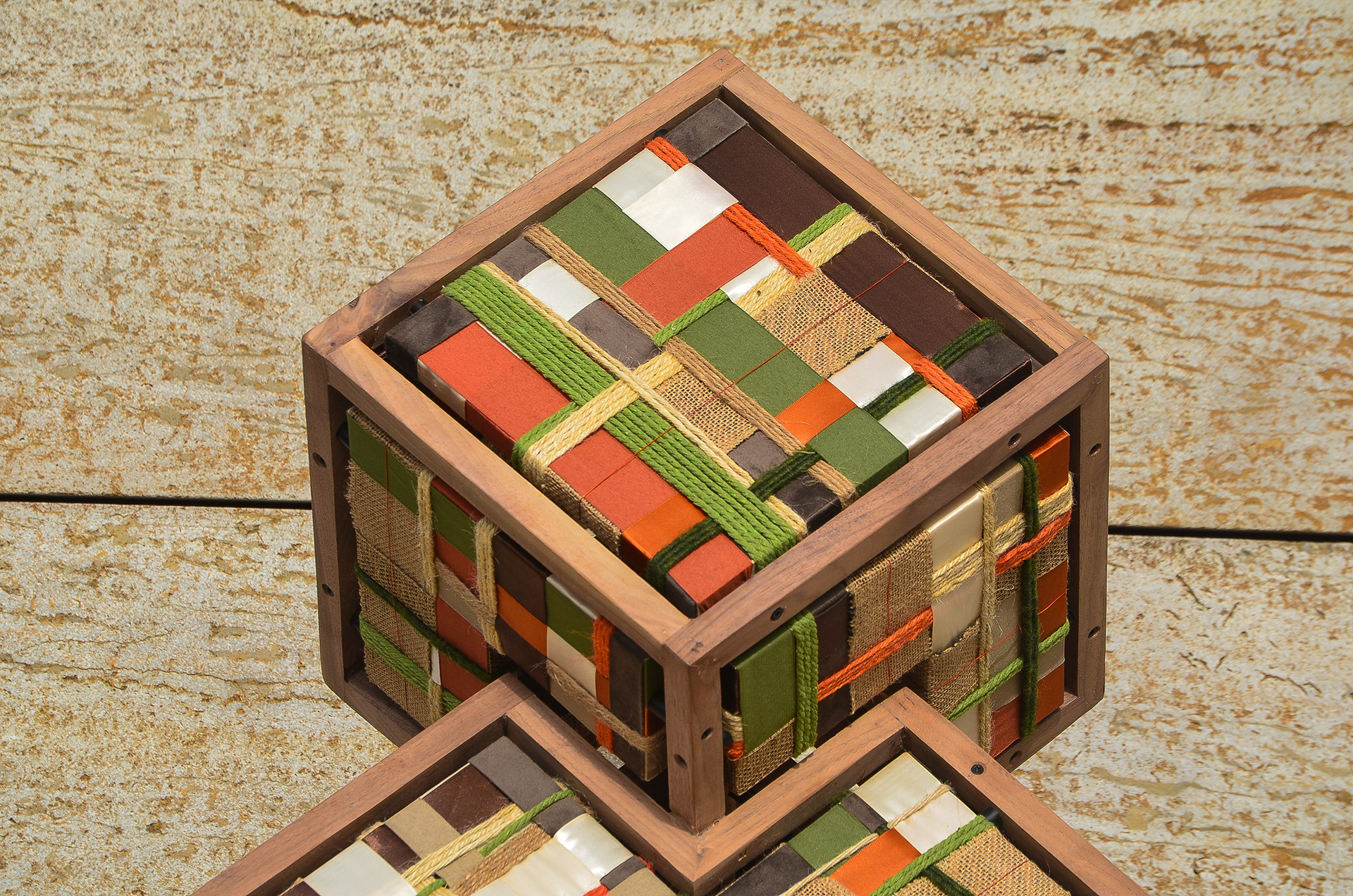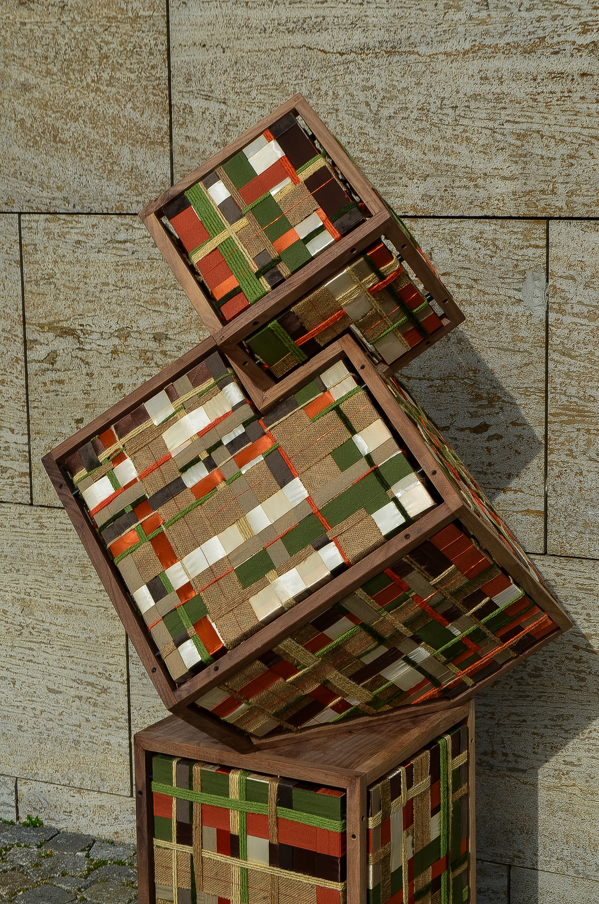 Between the Lines is built from stacked cubic frames in black walnut. Within the rigid structure, rope and ribbon are stretched into a controlled grid of rust, olive and raw jute tones. The work is driven by tension. The frame sets the limits, the textile moves within them. Light is held rather than exposed. Filtered through layered material, it creates depth instead of brightness. Structure and softness remain in balance. The atmosphere emerges between the lines.