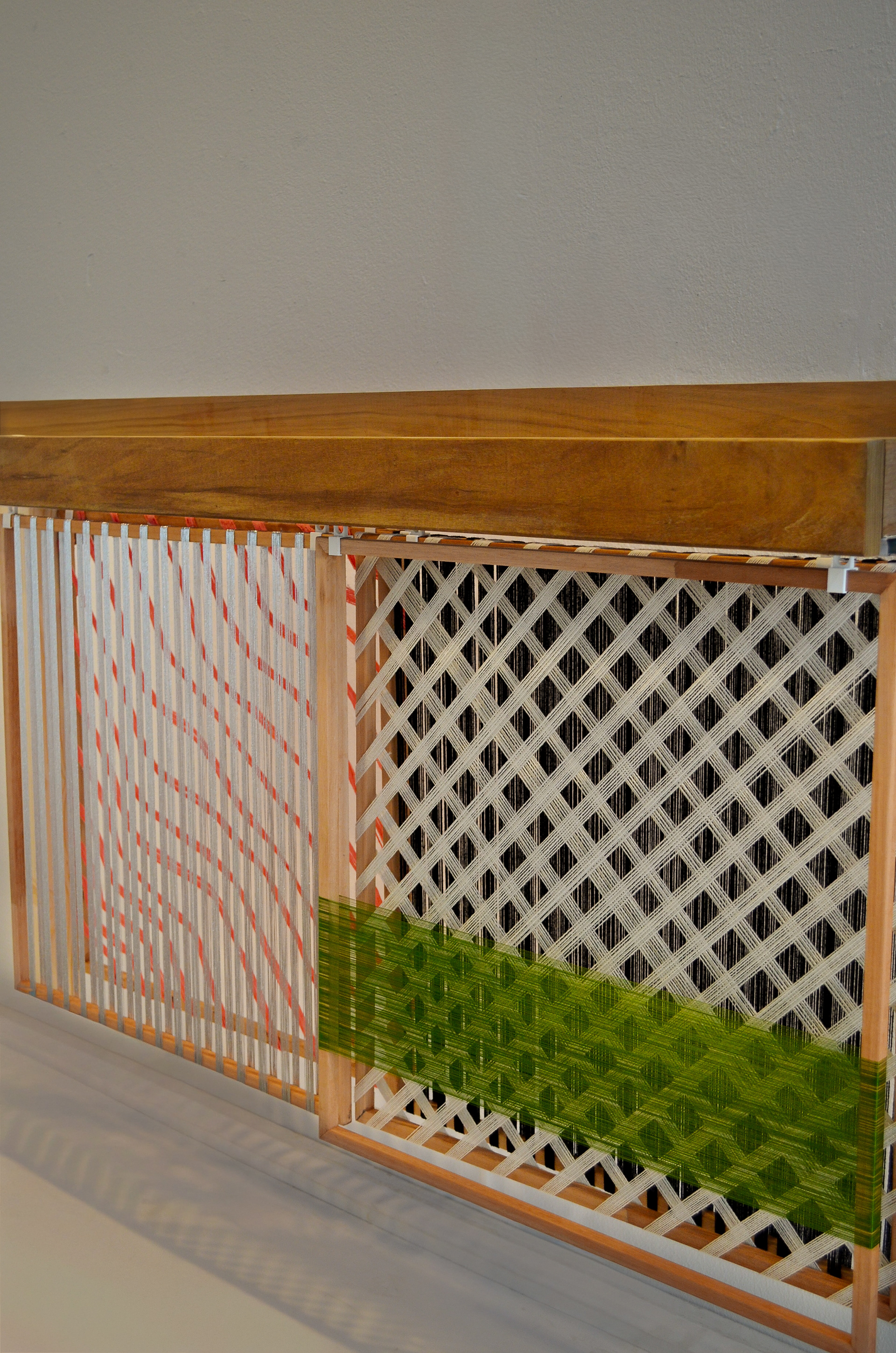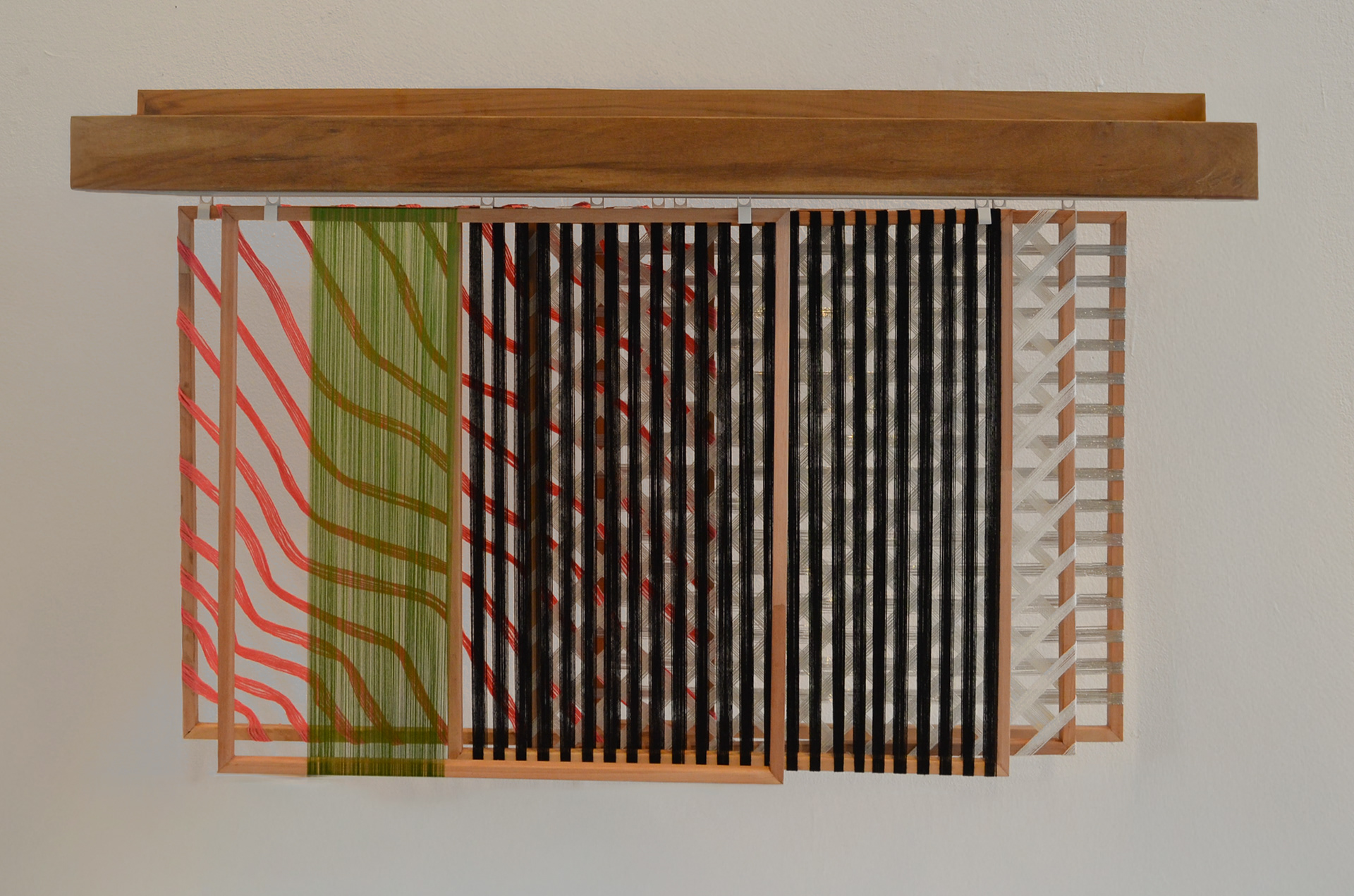 This design consists of multiple interchangeable frames wrapped with yarns. Each frame acts as a separate layer, but their real impact appears when they are placed together. By arranging the frames in different sequences and combinations in front of one another, an optical illusion emerges in which light, color, and depth interact.